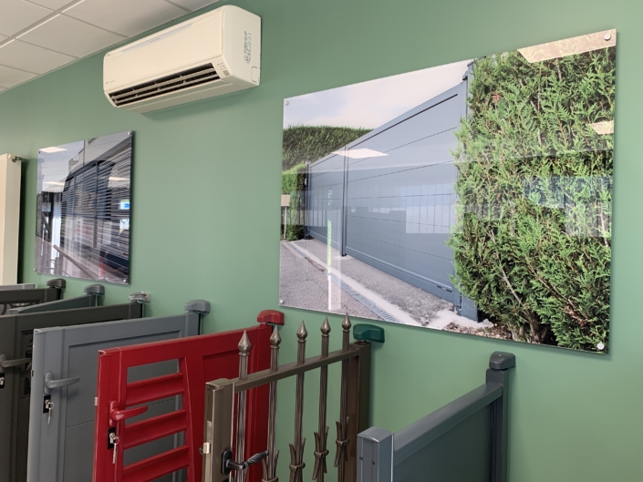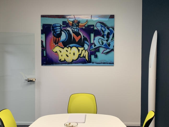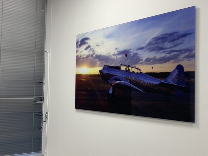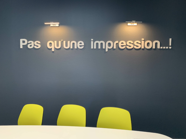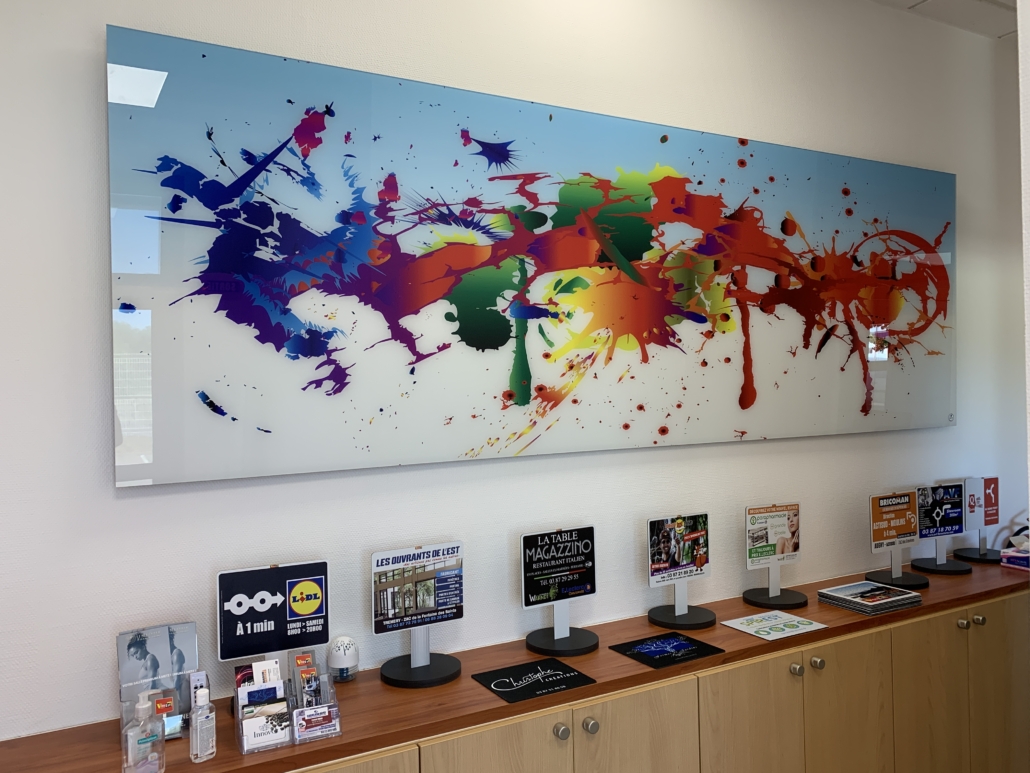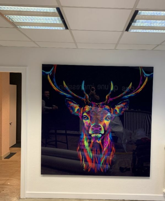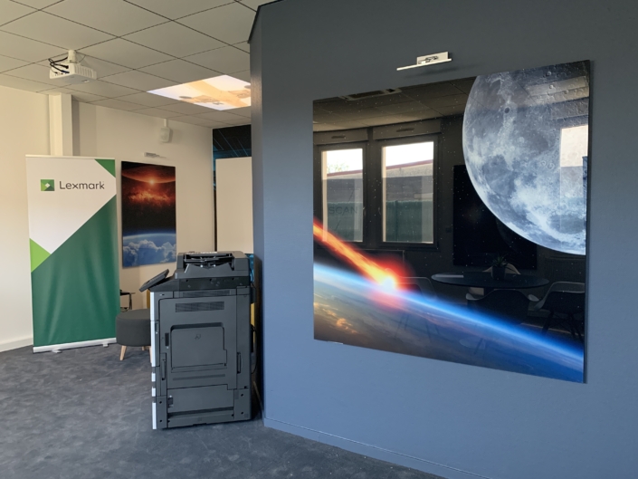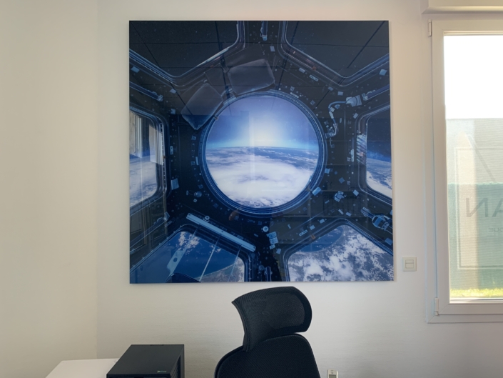 Impression UV avec vernis et encre blanche à plat et en rouleau jusqu’à 3.20 m de laize, impression en sublimation 3.20 m ou impression Latex, nous maitrisons en interne la production, la finition et le montage.